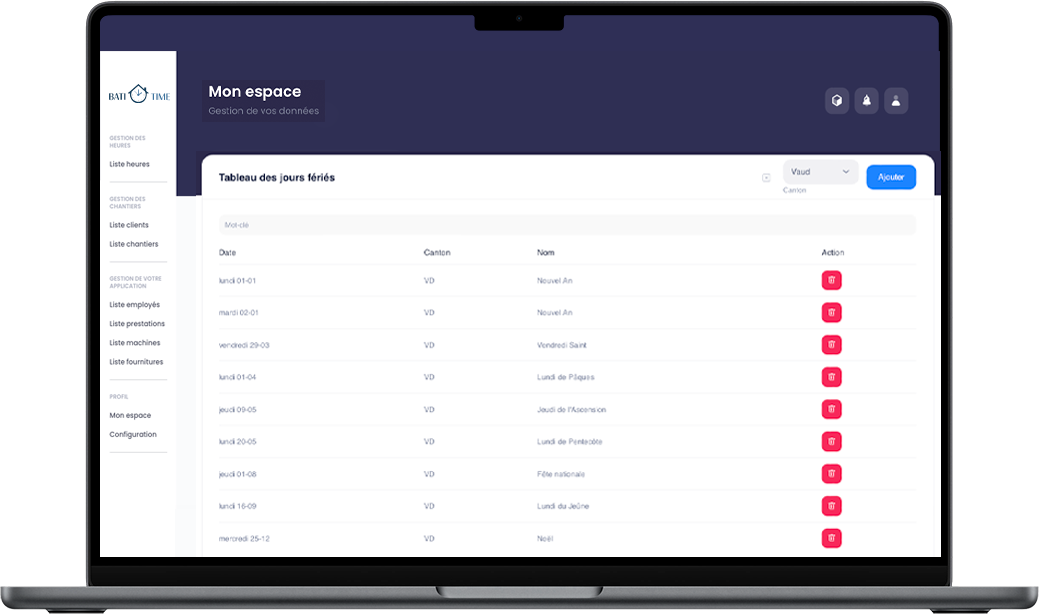 Notre fonctionnalité « Feuille d’heure » de Bati-Time transforme le suivi du temps en un processus transparent et sans effort. Que vous préfériez une vue d’ensemble hebdomadaire ou que vous ayez besoin de détails mensuels ou annuels, cette fonctionnalité s’adapte à toutes vos exigences. Idéale pour les responsables et les employés, elle offre une visualisation claire et instantanée des heures travaillées, simplifiant ainsi le suivi et la gestion du temps.
